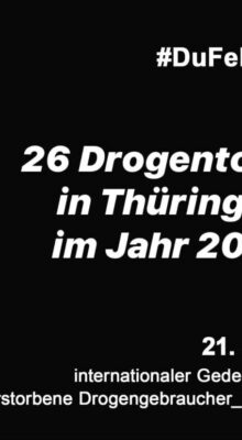 26 Menschen, davon 23 Männer und 3 Frauen starben 2019 offiziell in Thüringen an den Folgen des illegalisierten Drogenkonsums. Wir gehen jedoch von einer höheren Dunkelziffer aus.