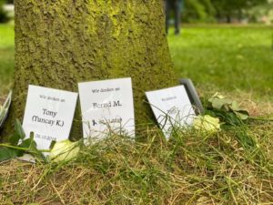 Am 21.Juli gab es in Hamburg zwei Mahnwachen, im Schwarzenbergpark in Harburg und in St.Georg vor dem Museum für Kunst & Gewerbe. Wir haben uns dieses Jahr für eine eigene Mahnwachen in Harburg entschieden da im letzten Jahr viele Drogengebrauchende verstorben sind, welche teilweise Jahrzehnte lang das Abrigado aufsuchten und sie viele Kontakte in die Szene und zu den Mitarbeitenden hatten.